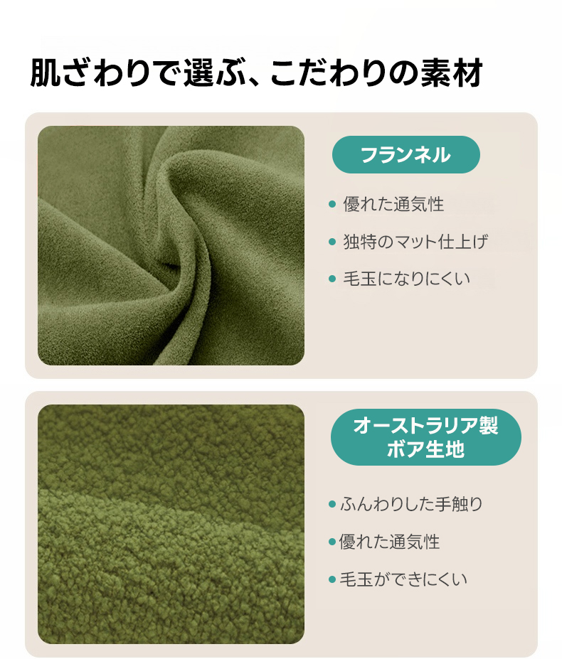- 【選べる素材と色】:フランネル生地とオーストラリア製ボア生地から選べ、どちらも通気性が良く毛玉になりにくい特性を持っています。カラーはホワイトとグリーンの2色展開で、お部屋のインテリアに合わせて選べます。