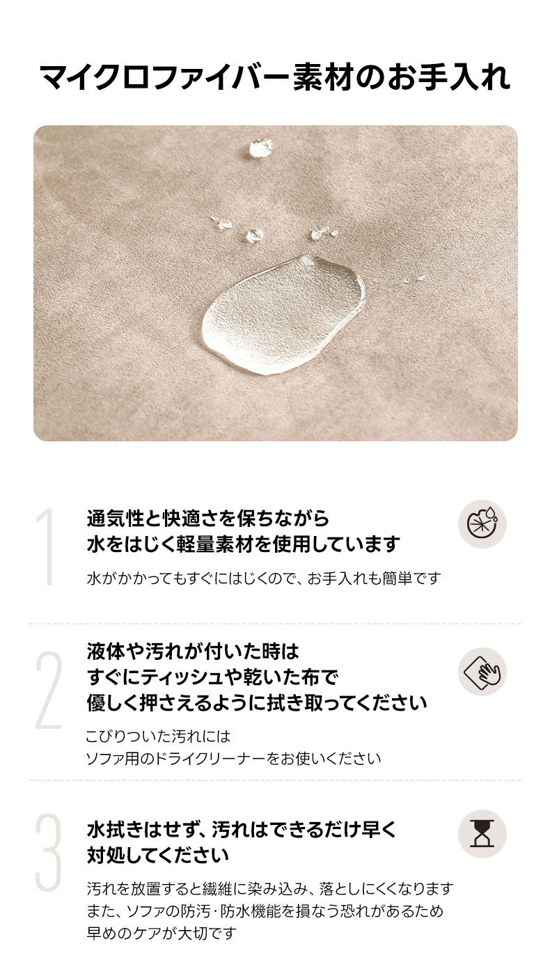- 【安心のメンテナンス性】高い防水性があり、水をこぼしてもさっと拭くだけでお手入れが簡単です。毛玉やシワになりにくい長持ち素材を使用しており、ペットのいる家庭でも安心してご使用いただけます。