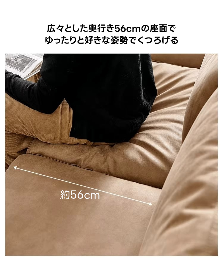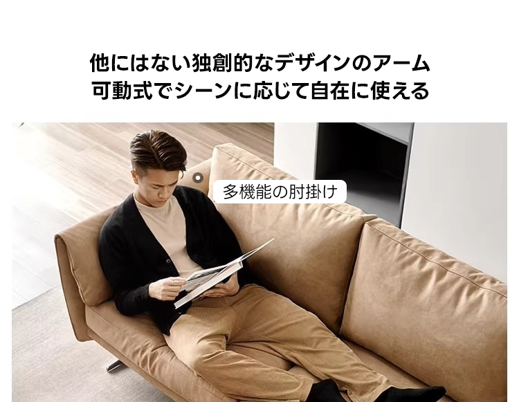 - 【広々としたスペースと可動式アーム】ユニークなアームデザインは可動式で、シーンに応じて自在に使用できます。広々とした奥行き56cmの座面は、ゆったりとした姿勢でリラックスできるスペースを提供します。