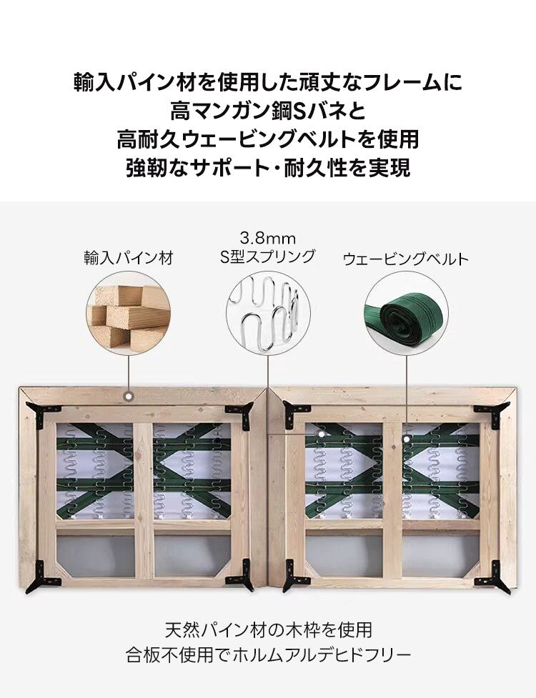 - 【耐久性と安全性を追求した設計】フレームには輸入パイン材を使用し、高マンガン鋼Sバネと高耐久ウェービングベルトで強靭なサポートを提供します。ステンレス製の脚部は堅牢で放射線物質を含まない安全な素材です。