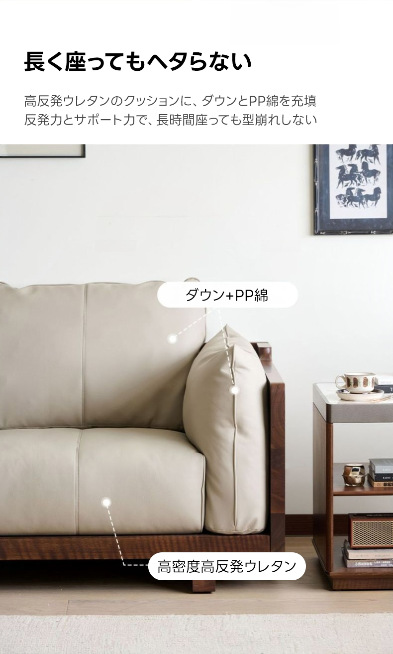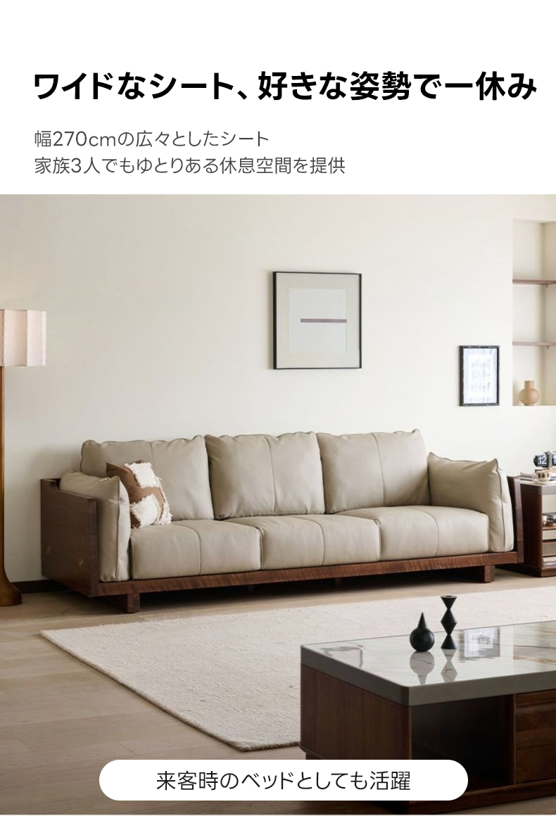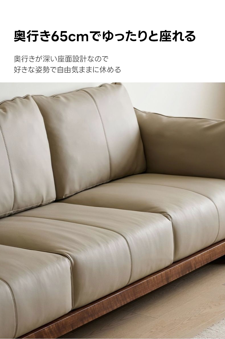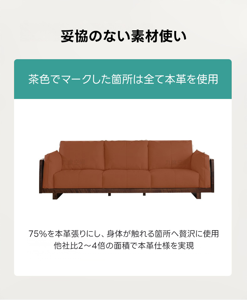 - 【高品質素材と環境への配慮】ソファの75%に本革を使用し、触れる部分には贅沢に本革を取り入れています。FSC認証とAHEC認証を取得しており、持続可能な森林管理を実践しています。