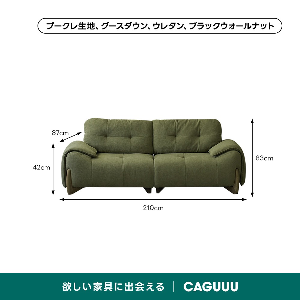 - 【高品質な素材とデザイン】耐久性と肌触りの良さを兼ね備えたブークレ生地を使用し、フレームにはアメリカ北部のウォールナットとパイン材を使用しています。丸みのあるフォルムが体に自然にフィットし、高級感を演出します。