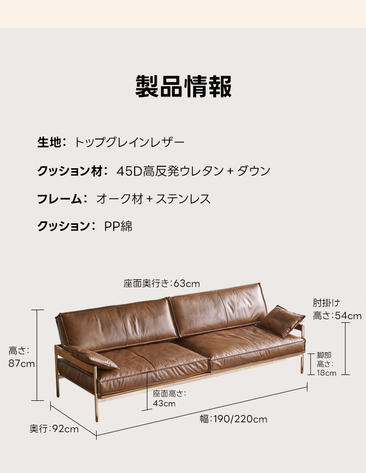 - 【高品質素材と耐久性】:トップグレインレザーを使用したレトロモダンフレームソファは、光沢感とソフトな肌触りが魅力。オーク材とステンレスのフレームは耐荷重性に優れ、長期間の使用にも耐えます。