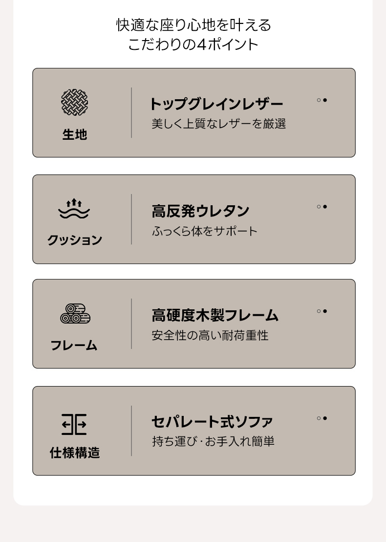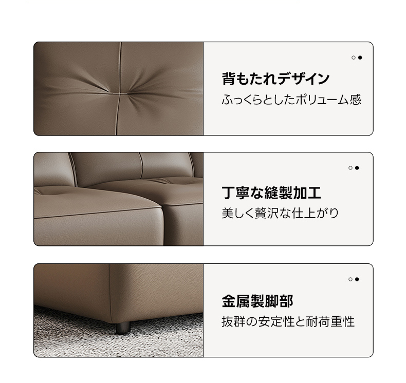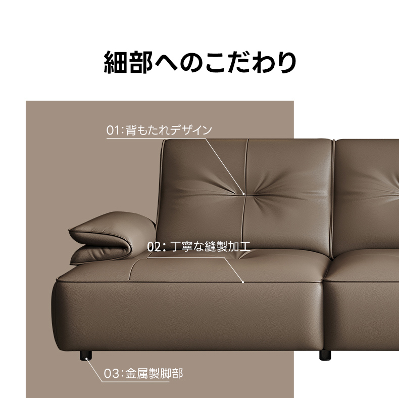 - 【トップグレインレザー使用】:このソファは高品質なトップグレインレザーを使用しており、美しいシボと色合いが特徴です。耐久性に優れ、なめらかな肌触りが長く続きます。高級感溢れるデザインで、どんなリビングにもぴったりとマッチします。