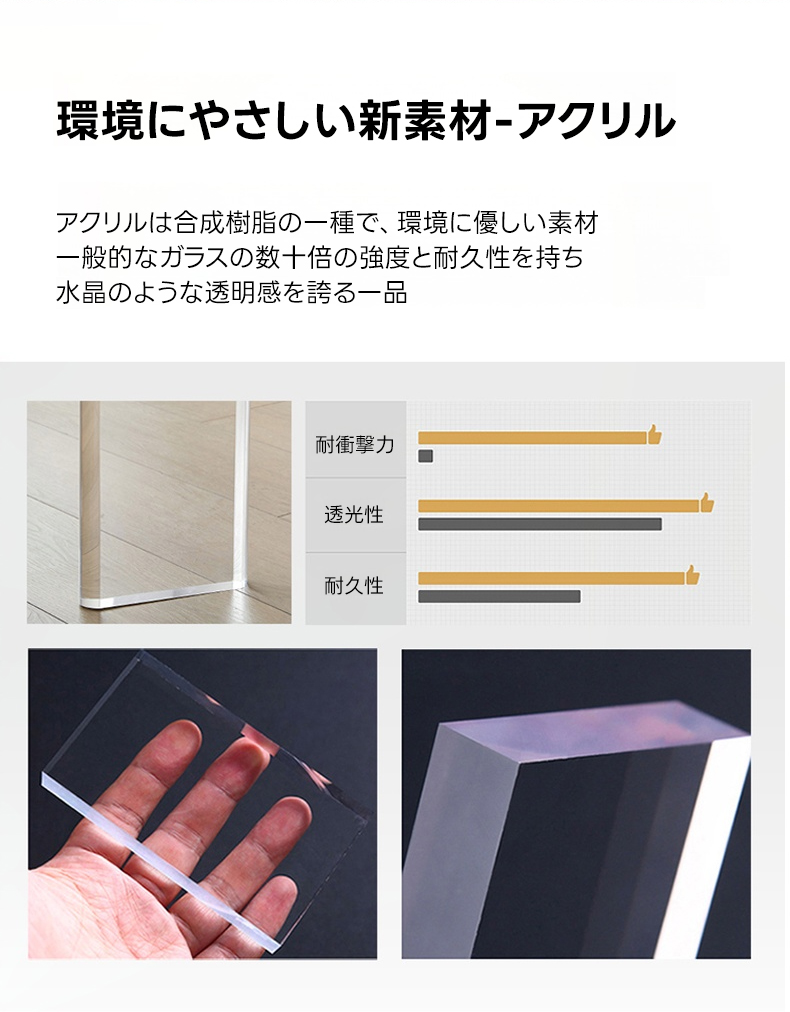 - 【高品質アクリル素材】環境に優しい合成樹脂を使用し、一般的なガラスの数十倍の強度と耐久性を持ちます。透光性が高く、クリアな見た目が空間に洗練された印象を与えます。