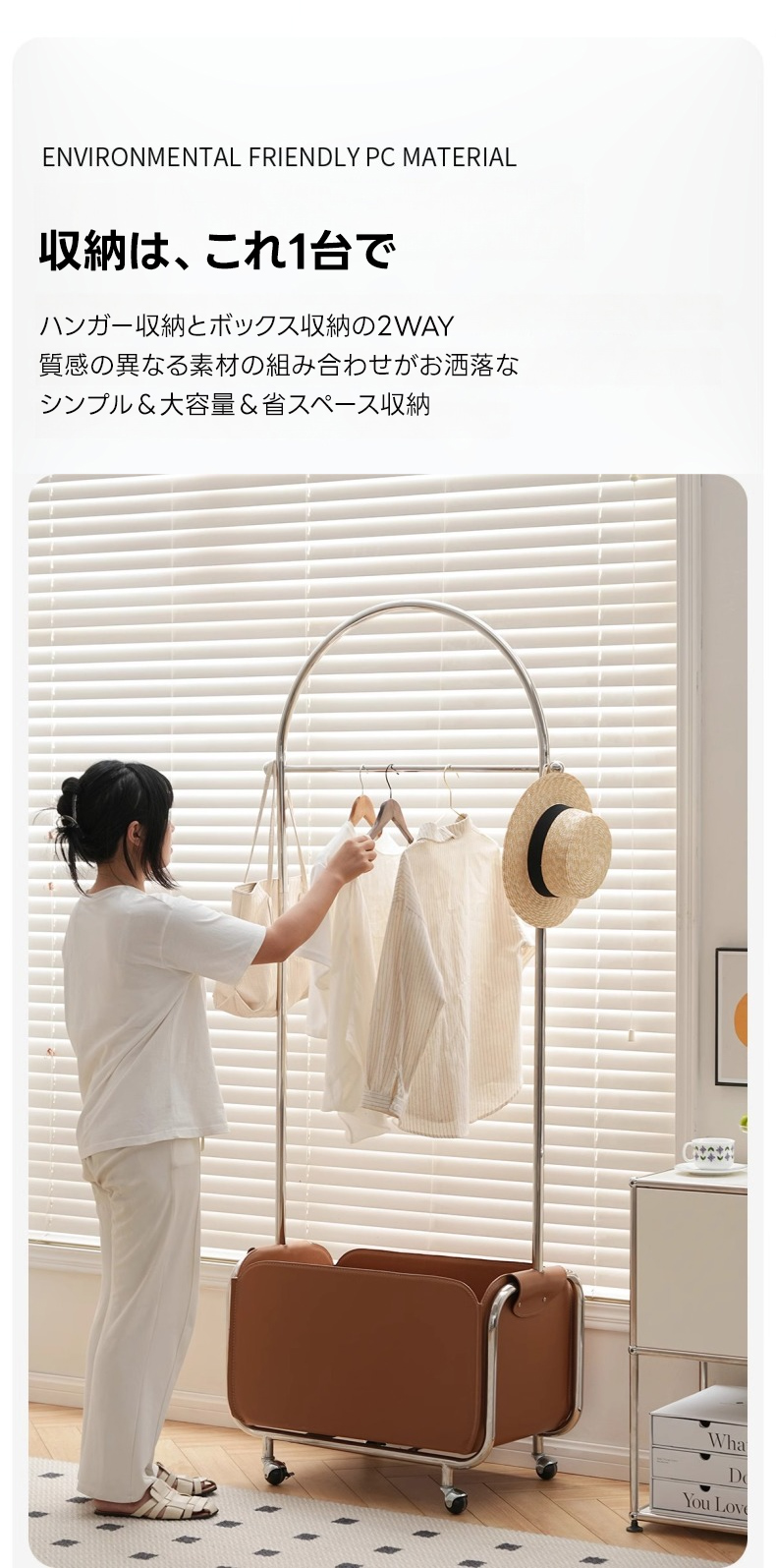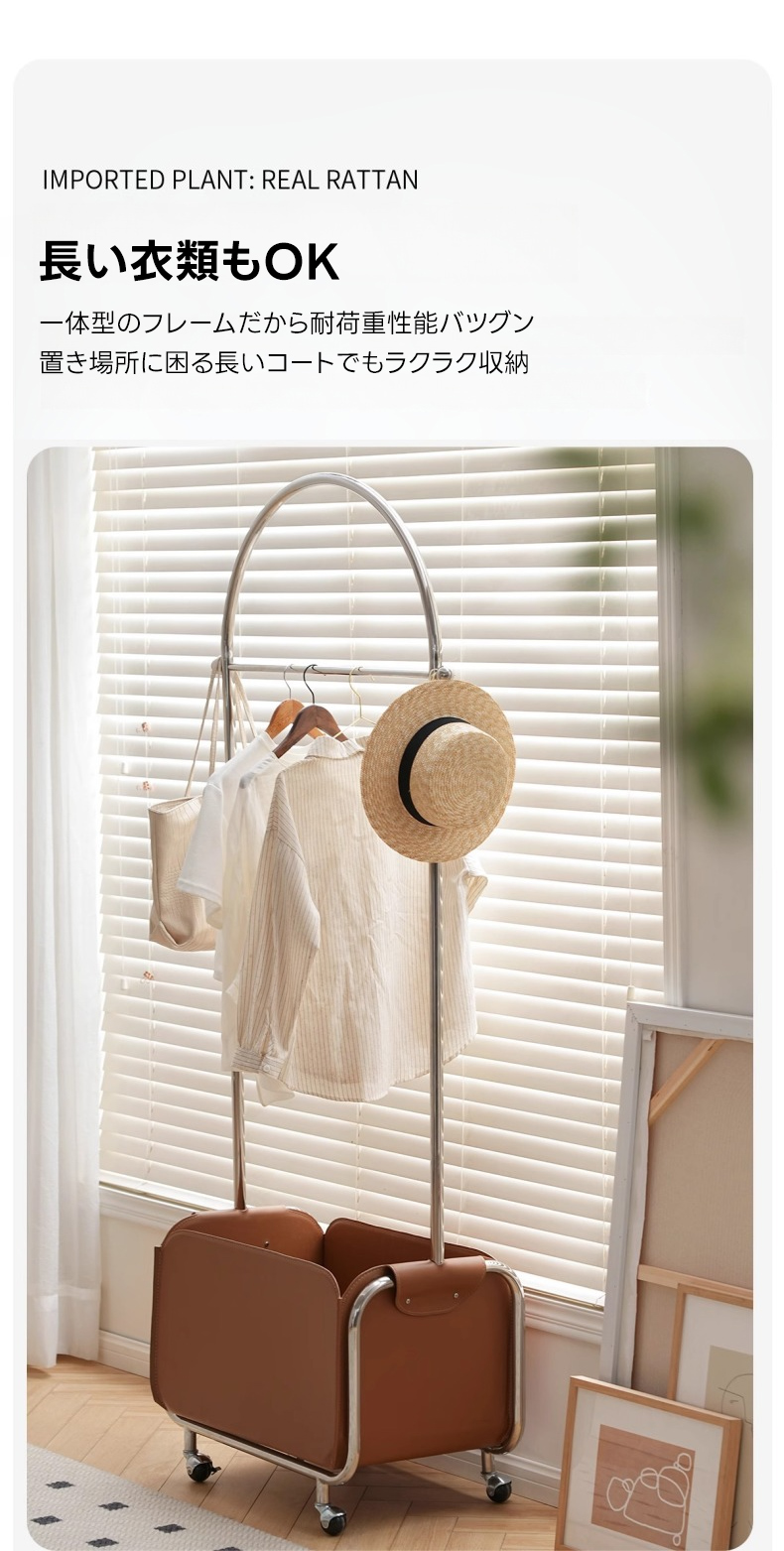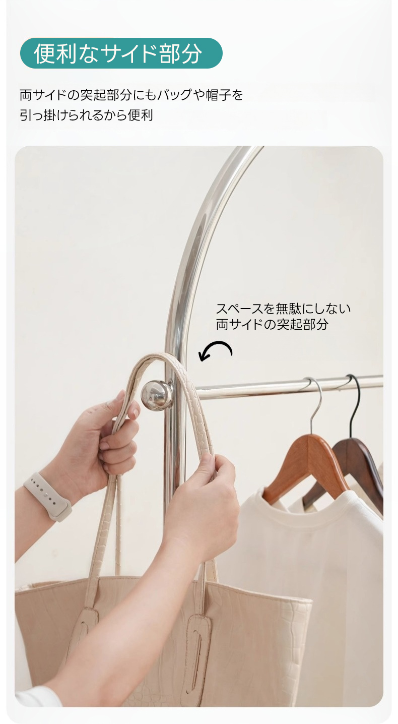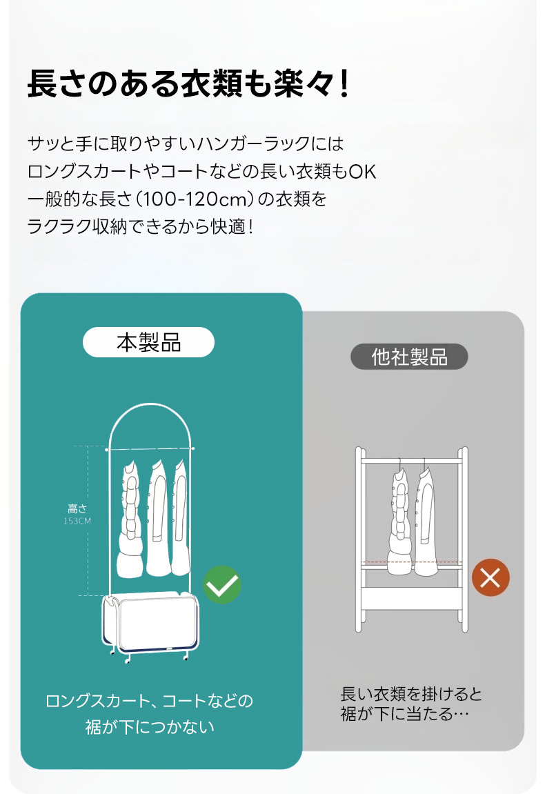 - 【便利な機能とユーザー価値】360°回転キャスター付きで、移動が簡単。ストッパー付きで安全に使用できます。両サイドの突起部分にはバッグや帽子を掛けられ、スペースを無駄にしません。長さ153cmのハンガー部分は、ロングコートやドレスも楽々収納できます。