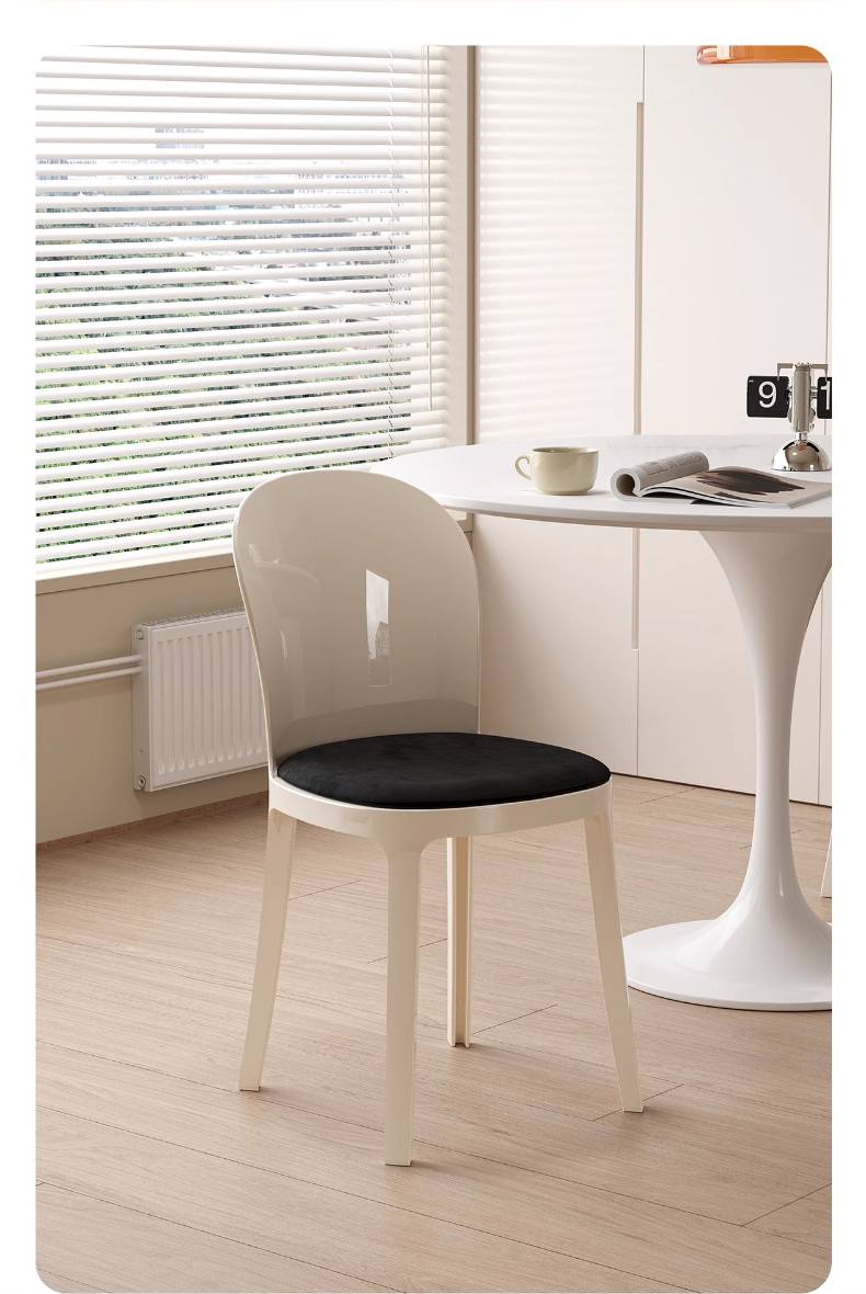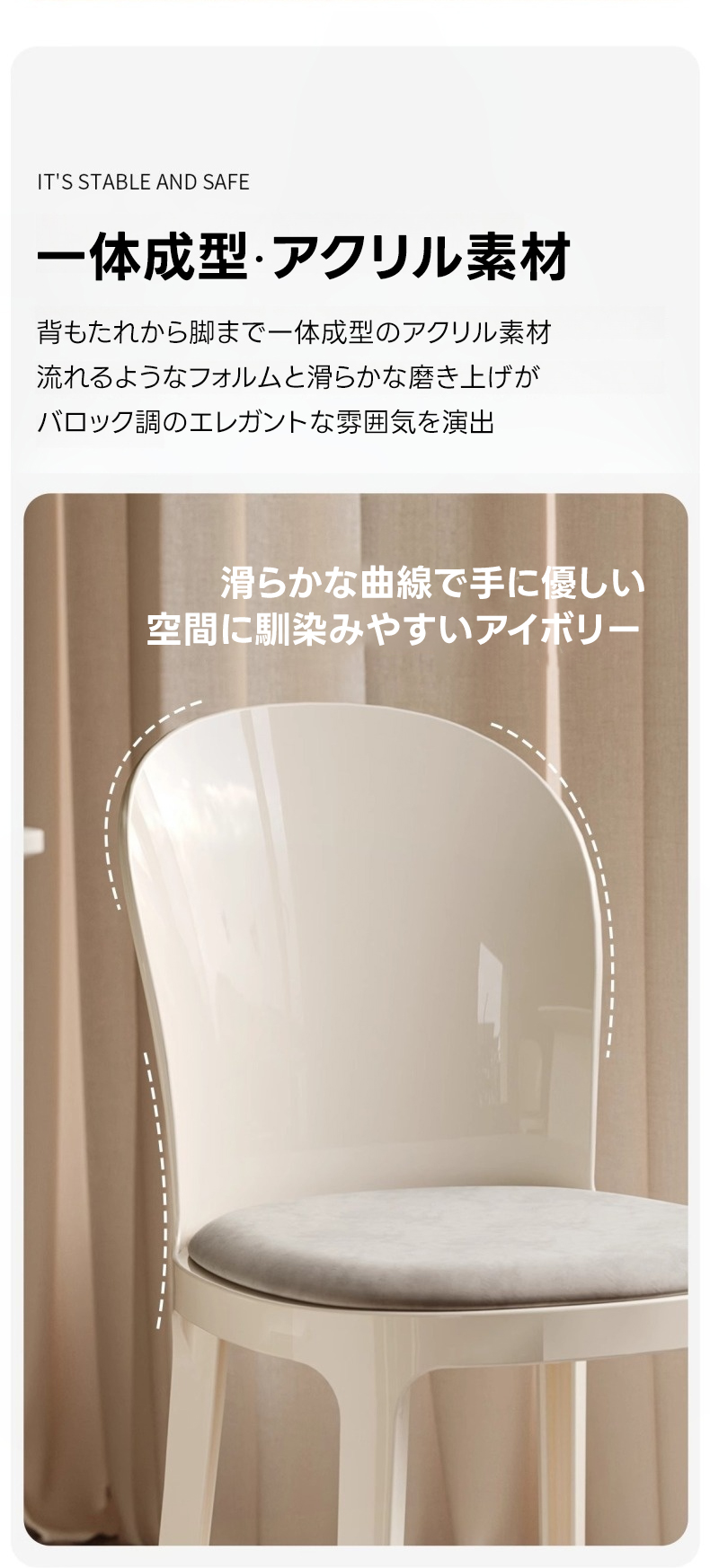 - 【透明感とエレガントなデザイン】:クリスタル調ダイニングチェアは、透明感のあるアクリル素材を使用し、ガラスのような輝きと滑らかな手触りを提供します。背もたれから脚まで一体成型されており、流れるようなフォルムがエレガントな印象を与えます。