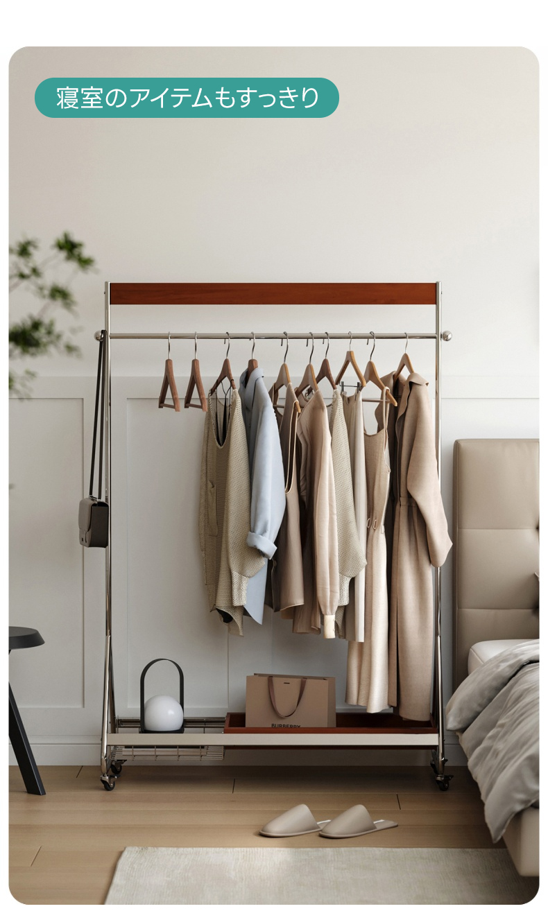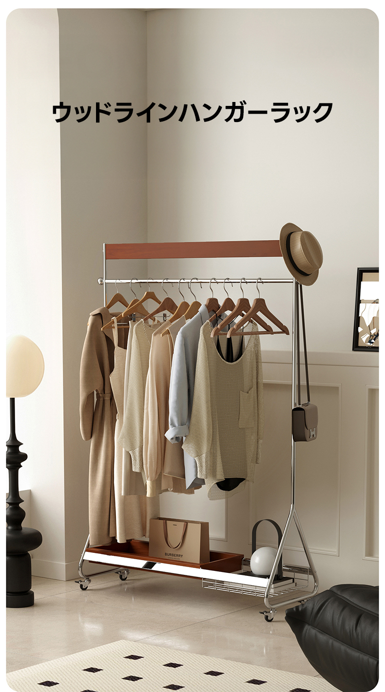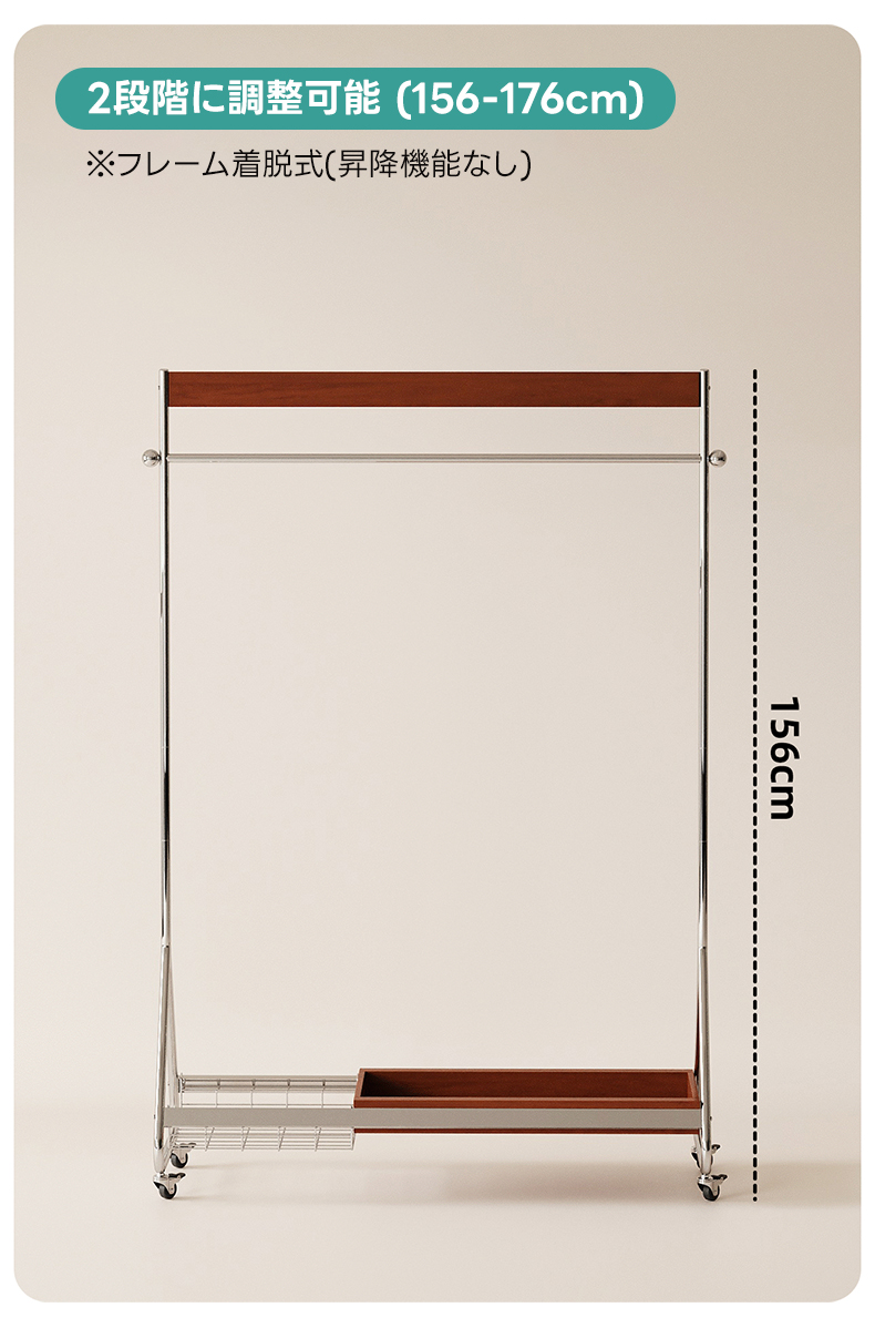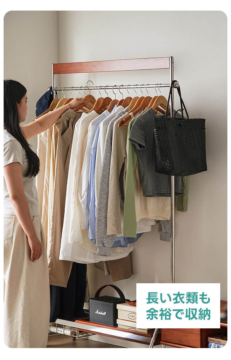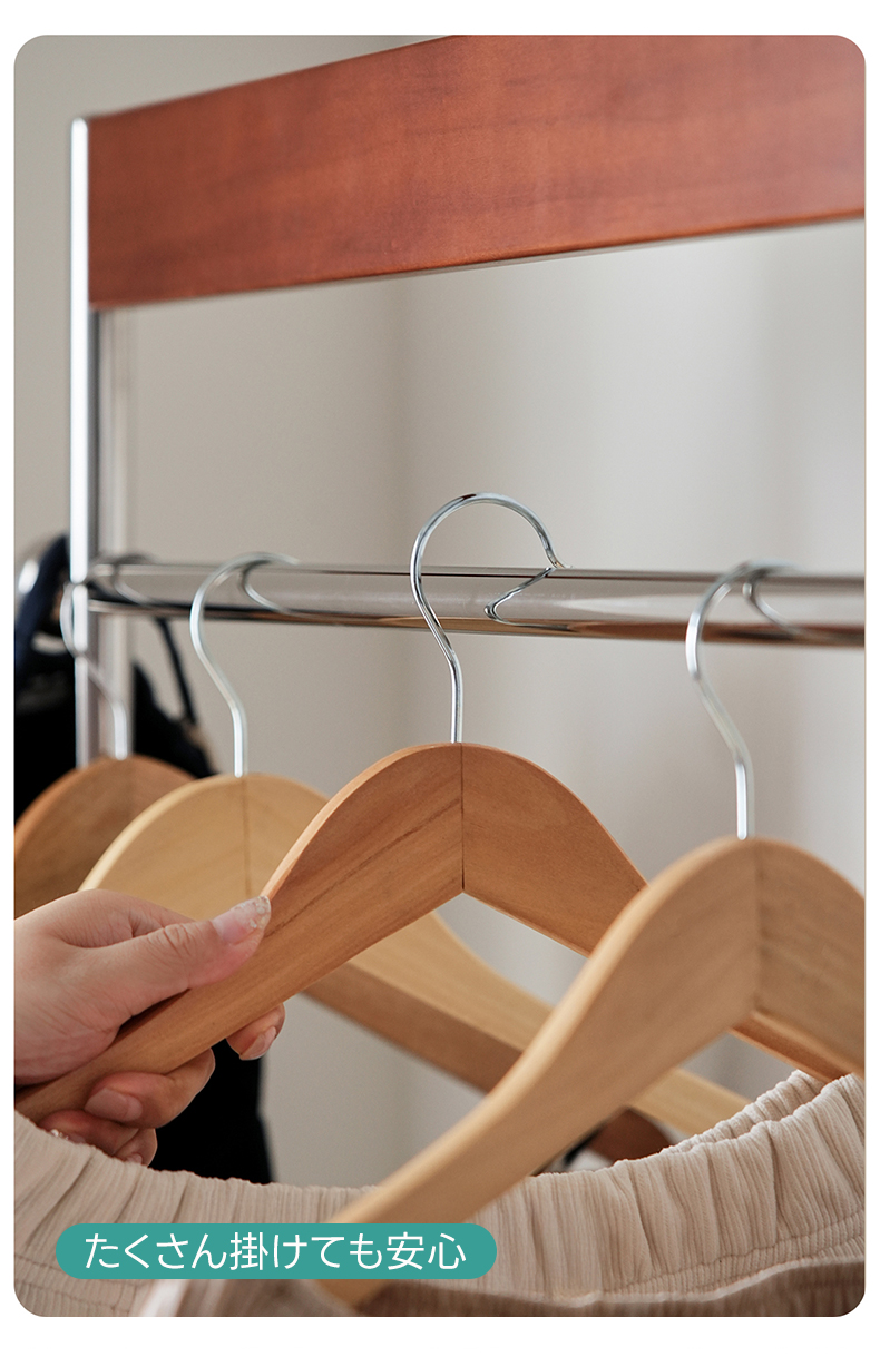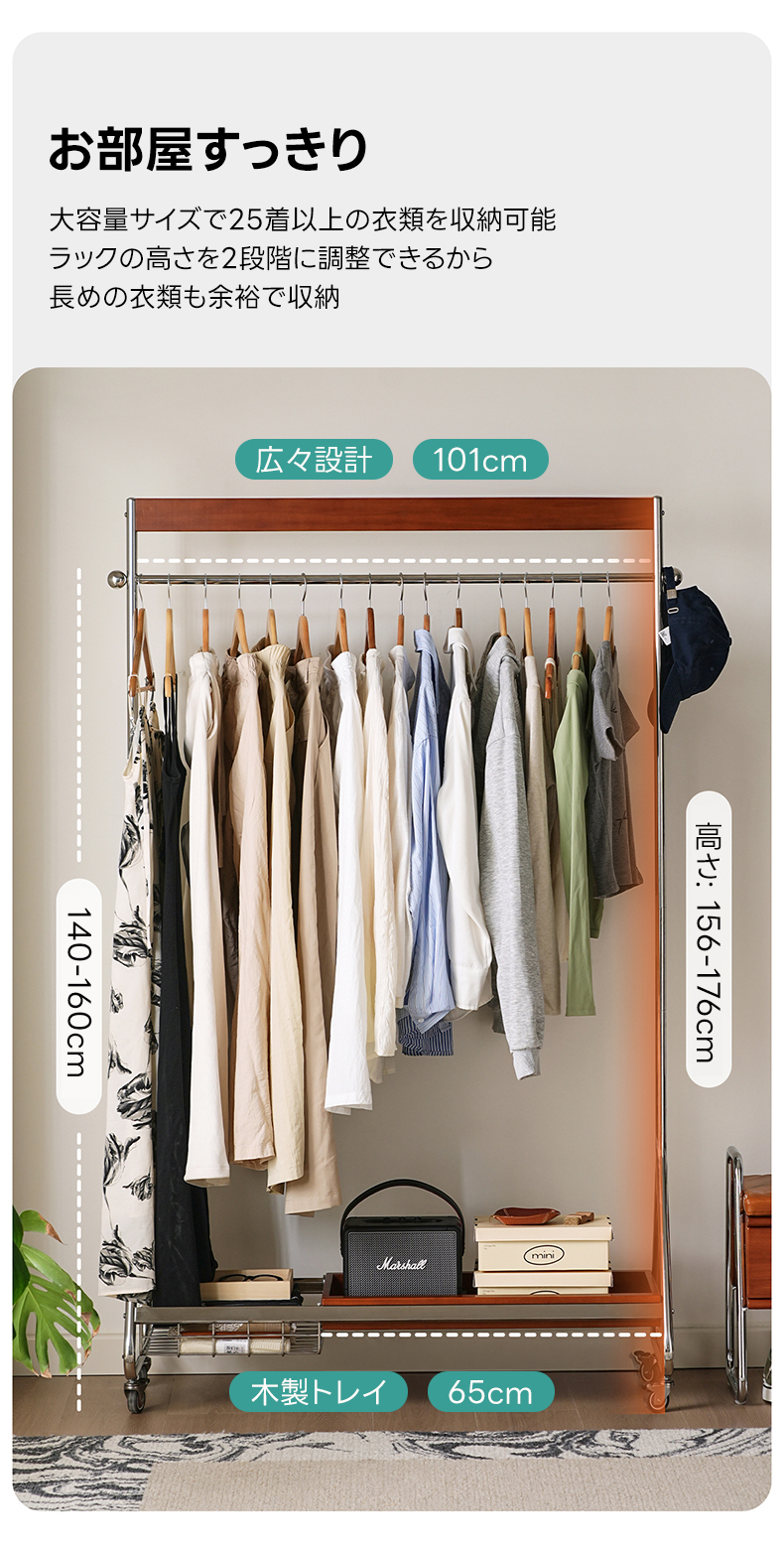 - 【優れた収納力と機能性】ウッドラインハンガーラックは、25着以上の衣類を収納可能な大容量設計。高さは156cmから176cmまで調整可能で、長い衣類も余裕で収納できます。キャスター付きで移動がスムーズ、ロック機能も付いており安全に使用できます。